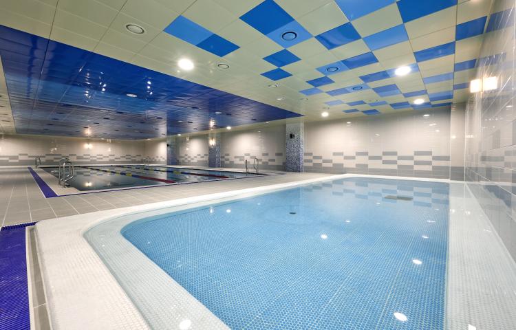 Featuring a full array of lifestyle amenities, including an indoor swimming pool, fitness center, indoor golf practice range, café, guest house, and gender-specific reading lounges.
