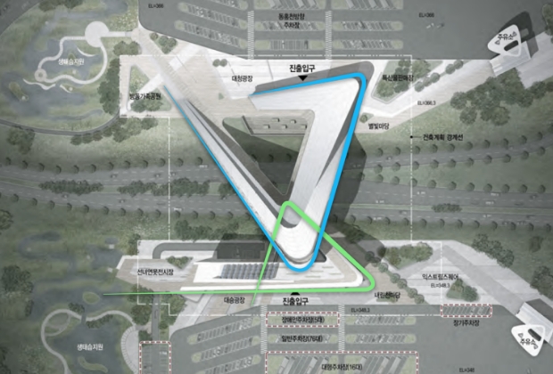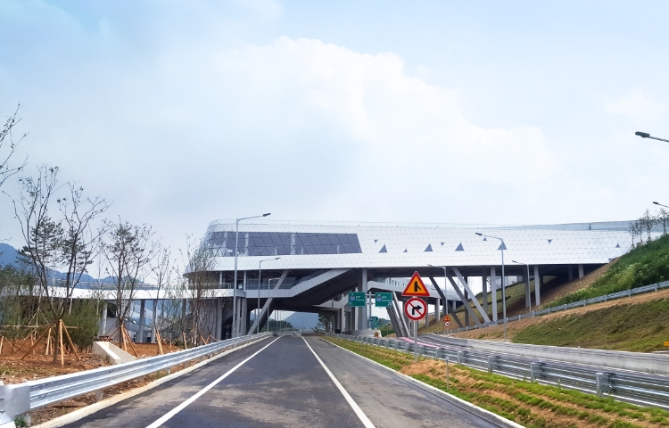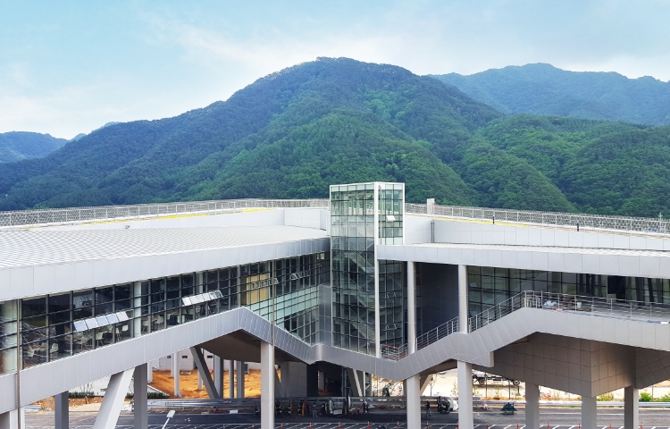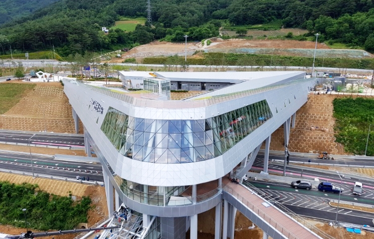The unique triangular shape of the Naerincheon Rest Area symbolizes a star, under the concept that one of the stars in the sky has landed on the ground, harmonizing with the surrounding environment and forming the Star Gate. This stylish and unique V-shaped service area has become a new landmark in Inje.