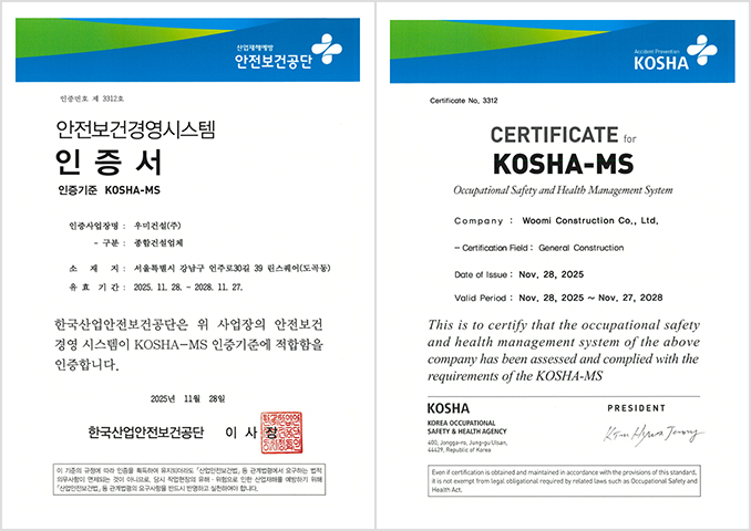 In 2022, Woomi acquired a KOSHA-MS Certificiate established by (Korea Occupational Safety & Health Agency) and is committed to establishing a self- discipline prevention system