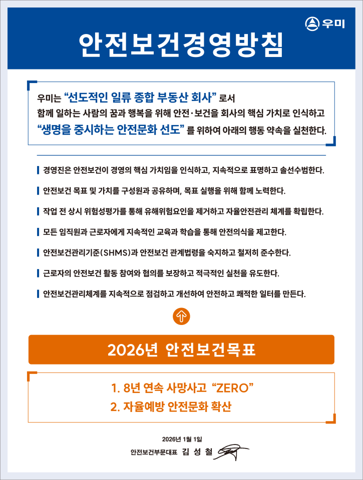 Woomi is making concerted efforts to establish a self-discipline prevention system, aiming to achieve zero fatalities. Furthermore, Woomi is dedicated to leading a safety culture that prioritizes life.